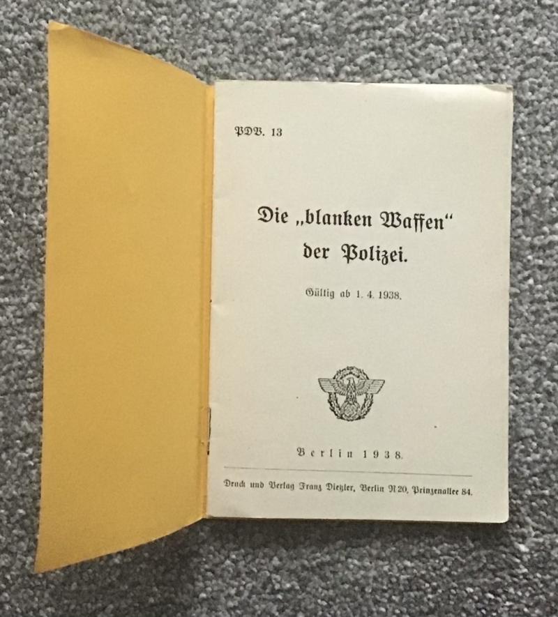 A pamphlet style book originally published in Berlin giving the official requirements for an official Police bayonet, including information regarding the shortening and modifications required for the transformation from Weimar to Third Reich. Great information for the German reader or the google translate app!