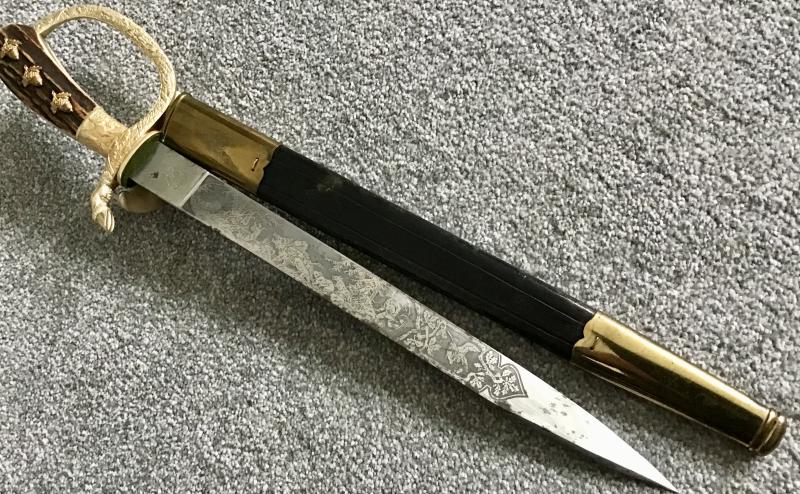 Super piece having the lightweight fittings we like to see on pieces of this era, having the classic Eickhorn squirrel emblem cast into the obverse ferrule area and a chamois cast into the reverse. Highly tactile grip plates are superbly fitted, having detailed acorn emblems. All the gilding remains to the hand enhanced knuckle bow and clamshell which has a stag depiction cast in. Triple etched blade is in excellent condition having very dark background to the hunting scenes on both sides. Minor age staining towards the tip. The ‘35-‘41 Eickhorn trademark is stamped to the reverse ricasso. A green blade washer is in place, beneath which the assembly number “348” is stamped. Leather covered black scabbard has twin line decoration to both obverse and reverse with upper and lower fittings attached by staples.