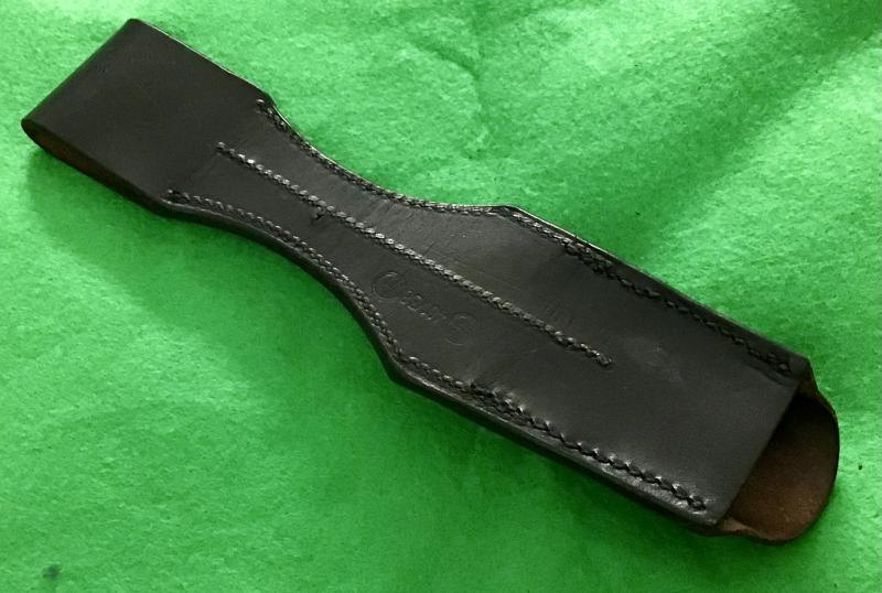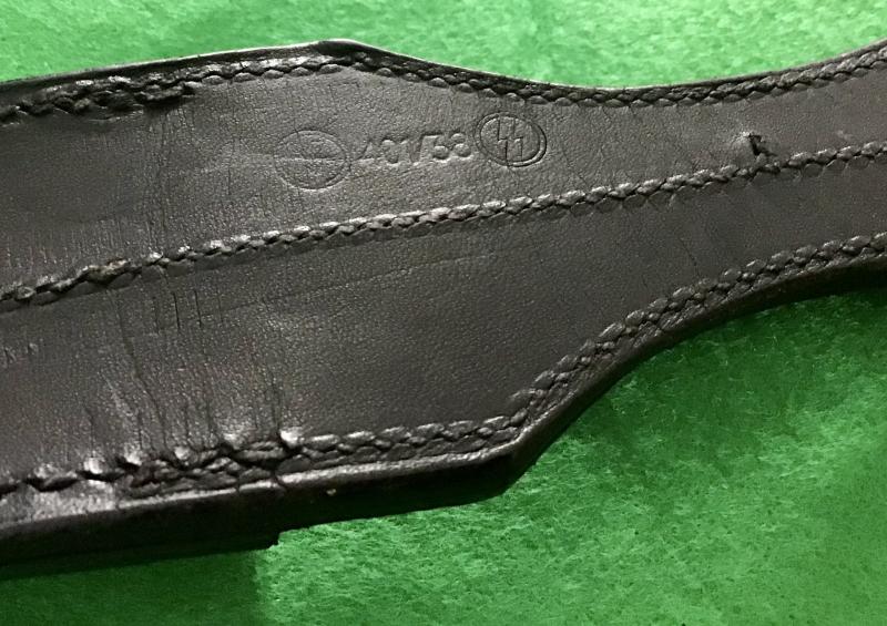 Excellent black leather frog having RZM markings and SS runes in a circle clearly stamped to the reverse. All stitching complete and with a period repair to the scabbard lug hole. Rare item.