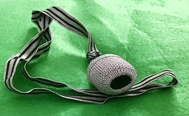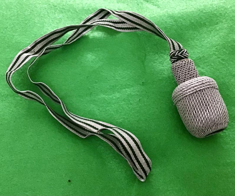 A totally period and virtually mint portepee suitable for the subordinate forestry side arm-those with the stag grips. Silver strap with twin green lines, silver and green slide, silver open weave stem, silver crown and silver oval acorn. Base of acorn has twisted green wire infil.