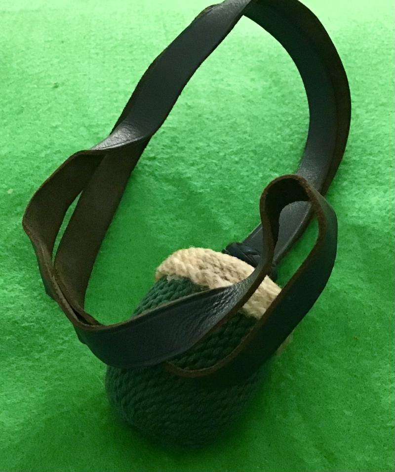 Identified as the correct portepee for a 1st Battalion Staff Member bayonet, it has a grey/blue leather flat strap, blue leather slide, white wooden crown and green oval acorn. Excellent condition.