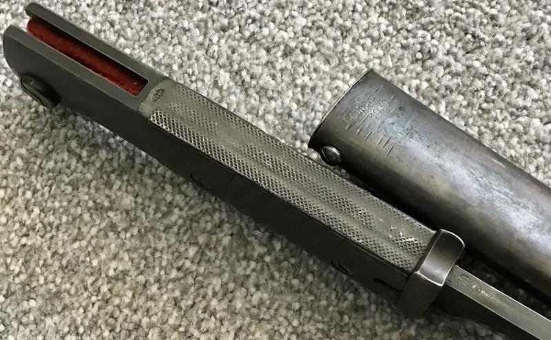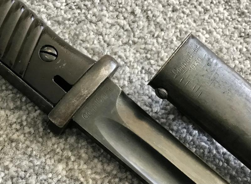 Crossguard, pommel and backstrap in near perfect condition with all finish remaining. Backstrap has an unusual “knurled” finish. Operating mortice button with red felt in the slot. Bakelite grips have countersunk screws and nuts. Mear mint blade retains 95% of its factory bluing and has only the most minimal signs of sharpening. Matching numbers stamped to obverse ricasso and adjacent scabbard upper. Upper spine dated 1939, reverse ricasso “Coppel G.m.b.H.”
