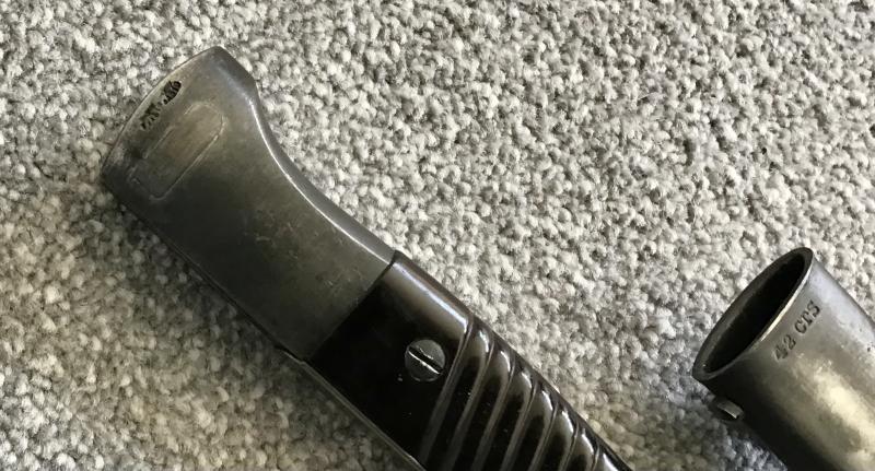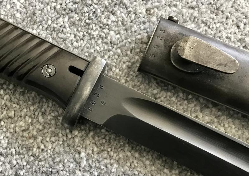 Working release button, waffenampt marking to upper pommel reverse. Bakelite grip plates correctly attached. Blade has full bluing other than a small area near the tip. Blade marked “9023”to ricasso with matching number to upper scabbard. Blade reverse marked “42CRS” indicating manufacture by Paul Weyersberg and Co of Solingen