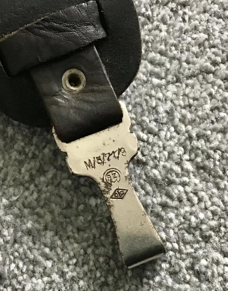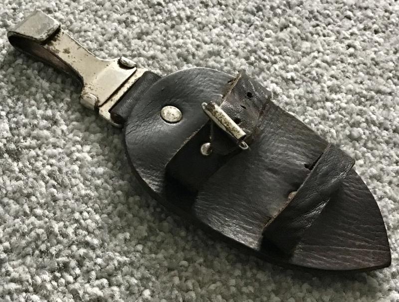 Superb “teardrop” shaped dark brown leather hanger designed to keep the SA dagger in a vertical position when marching or on field exercises. An RZM and OLC marked spring clip is held in a separate strip of leather riveted to the upper section, whilst a leather scabbard support strip is riveted to the lower end. A grip strap with operating buckle is riveted to the centre.