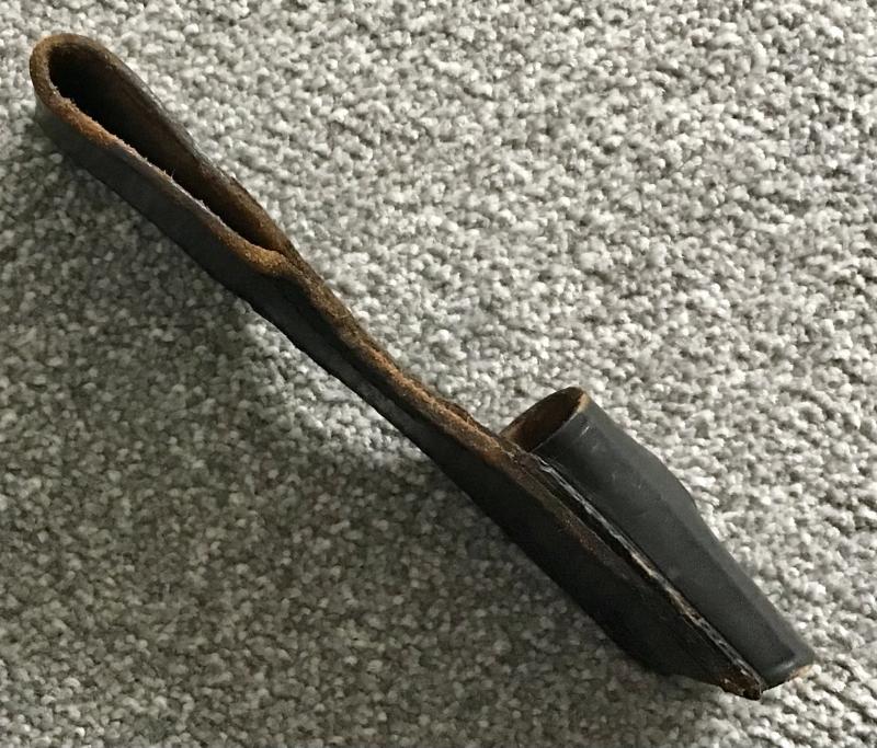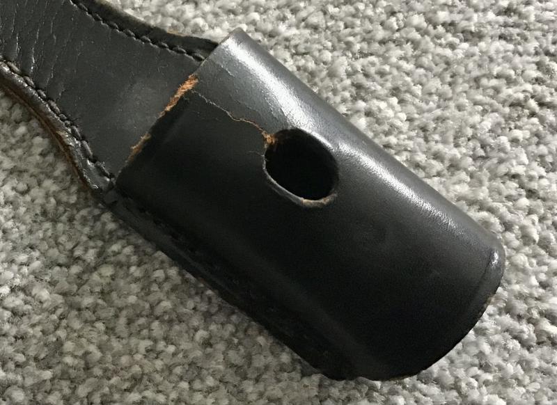 Black leather frog with excellent finish and complete stitching. Lug hole intact with minor split to the upper edge.