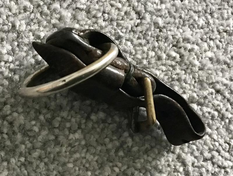 A single piece leather dagger hanger which has been period modified to include a large metal ring where the original spring clip would have been. Held together with rivets and period wire wrap.