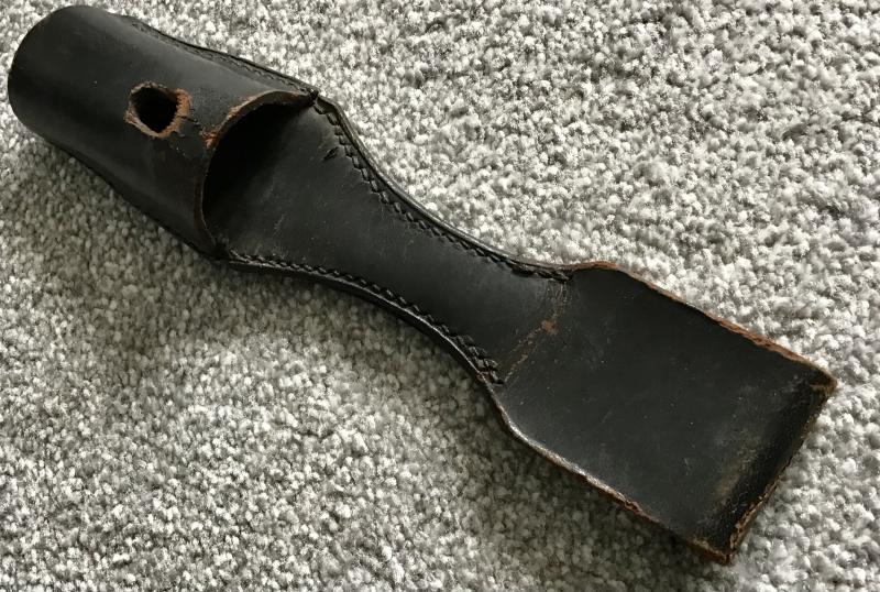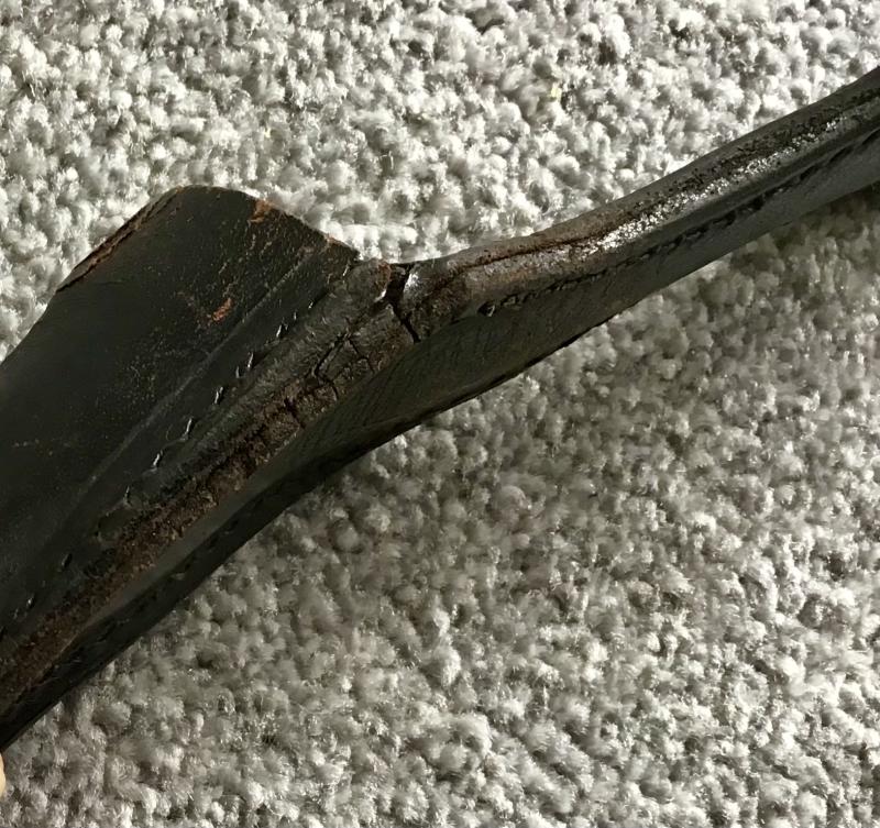Black leather frog from the dress bayonet. Minor stitching loss to one corner where the shoe meets the backing. No damage to the scabbard lug hole.
