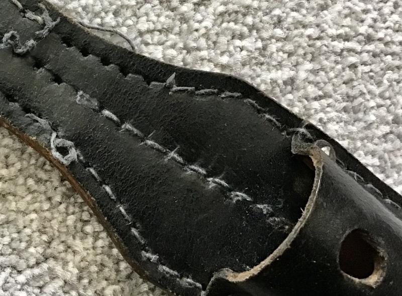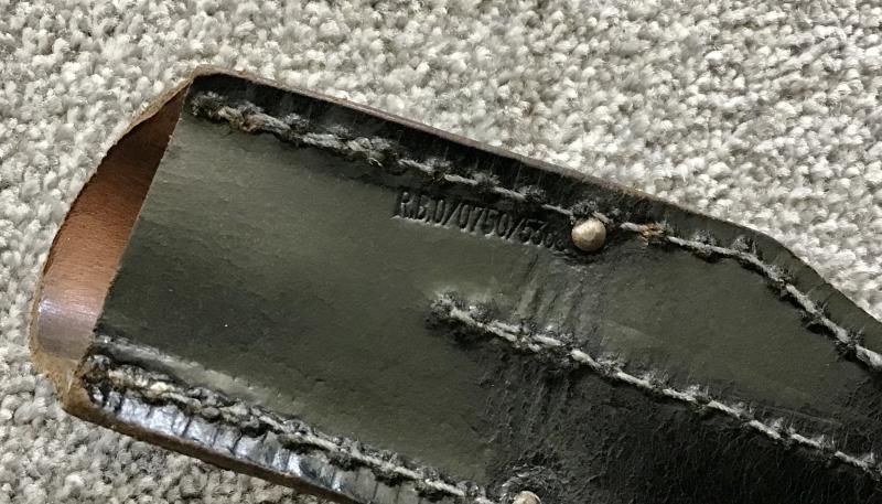 A good black leather frog of four rivet construction having an “RB” number stamped to the reverse. No damage to the scabbard lug hole, some loose stitching.