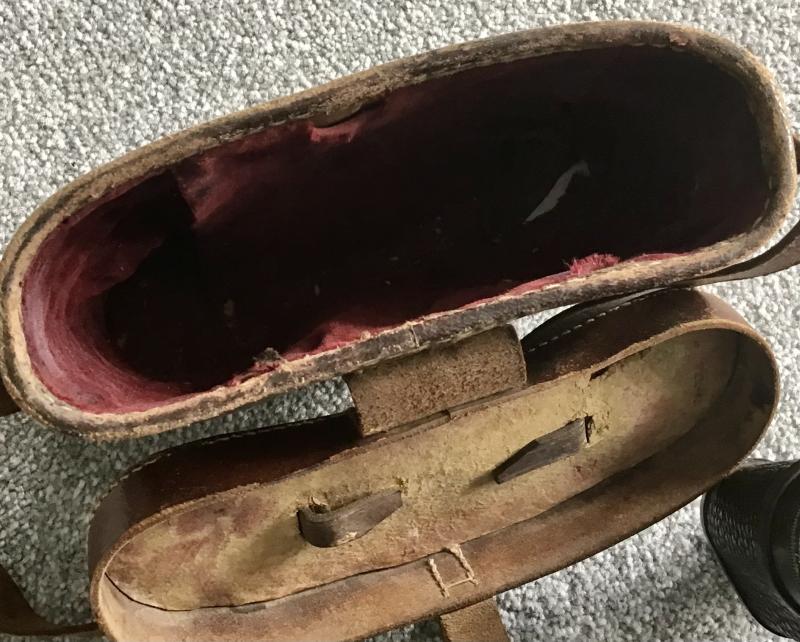 Dated 1940 and manufactured by Watson Baker in Welwyn, this set have clear optics and graticules and are complete with hard to find original leather hanging strap. “Crows foot” stamped. Leather storage case is in good condition with a red velvet interior.