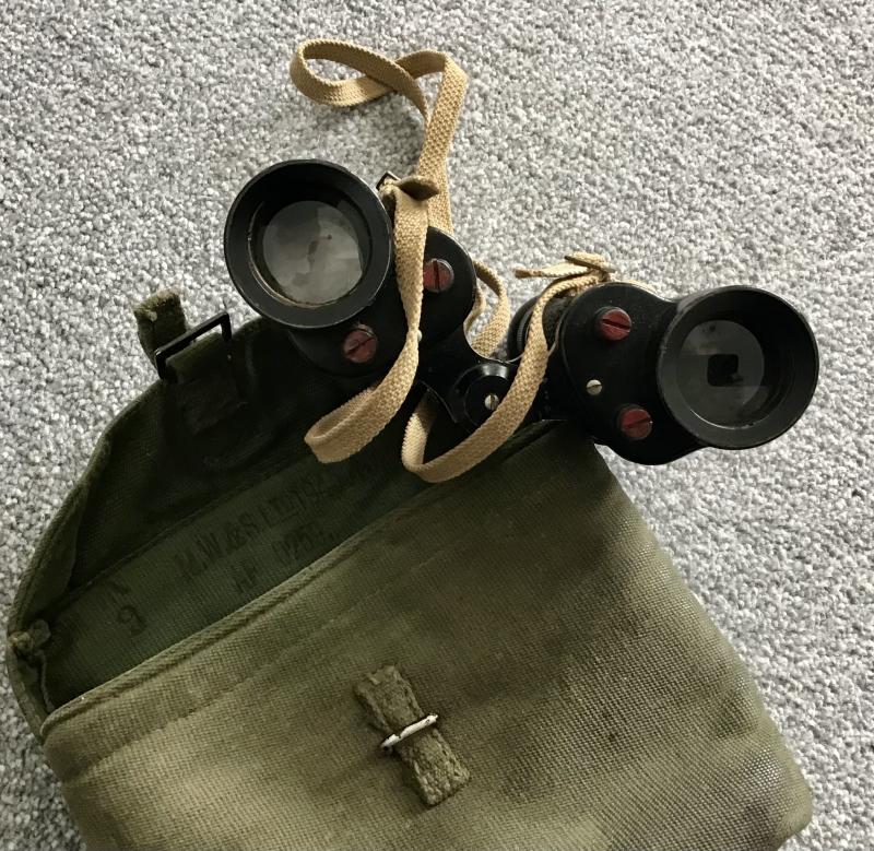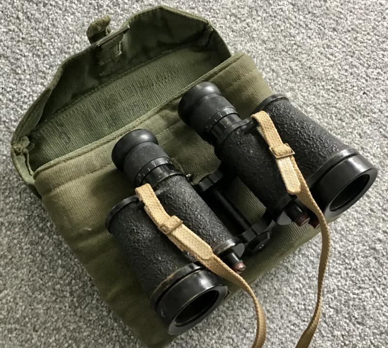 Excellent set having clear optics and complete with tropical carrying strap and case. Case is padded and both maker and date marked with MOD “crows foot” marking.