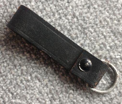 A nice quality adjustable length hanger having decorative stitching to its edges. Length adjustment is via the normal movable domed rivet. Fixings of Spring clip to the lower half of the teardrop have unfortunately pushed through the rear covering, however this item would still display well from the front and would be of particular interest to anyone looking for an item showing period wear. read more